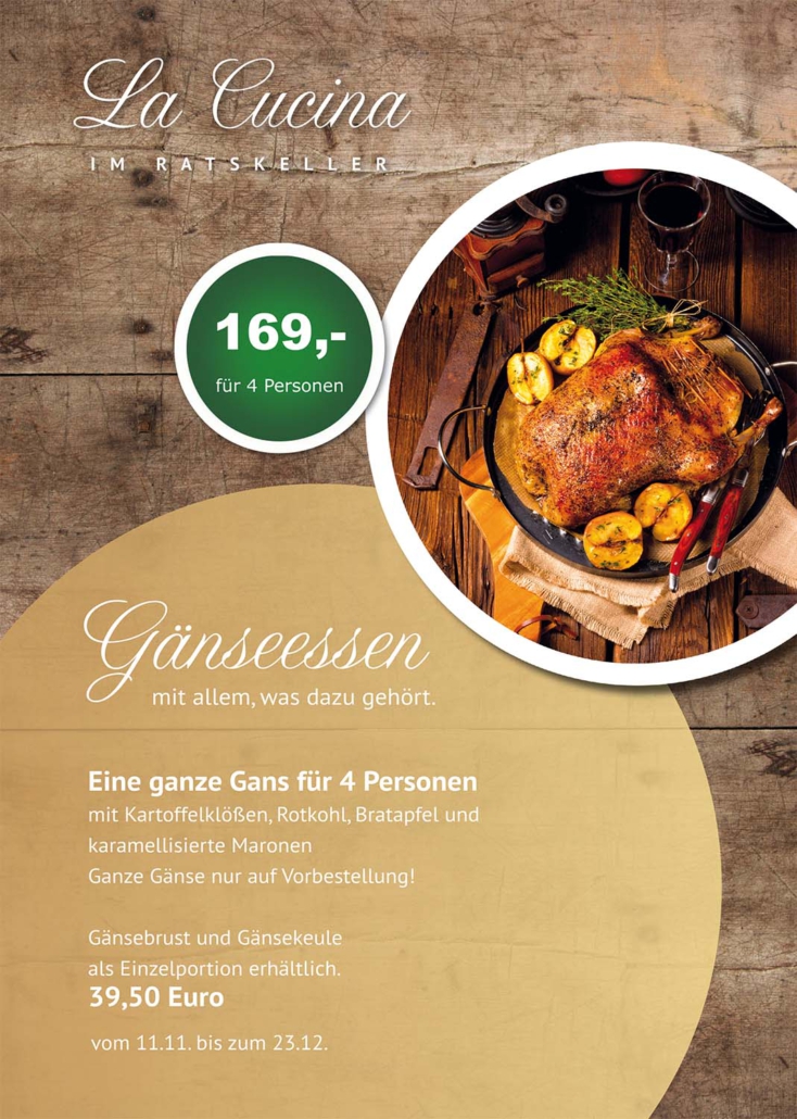 - Dienstag15,50 €Vorspeise: Gänsebrühe mit Gänseklein